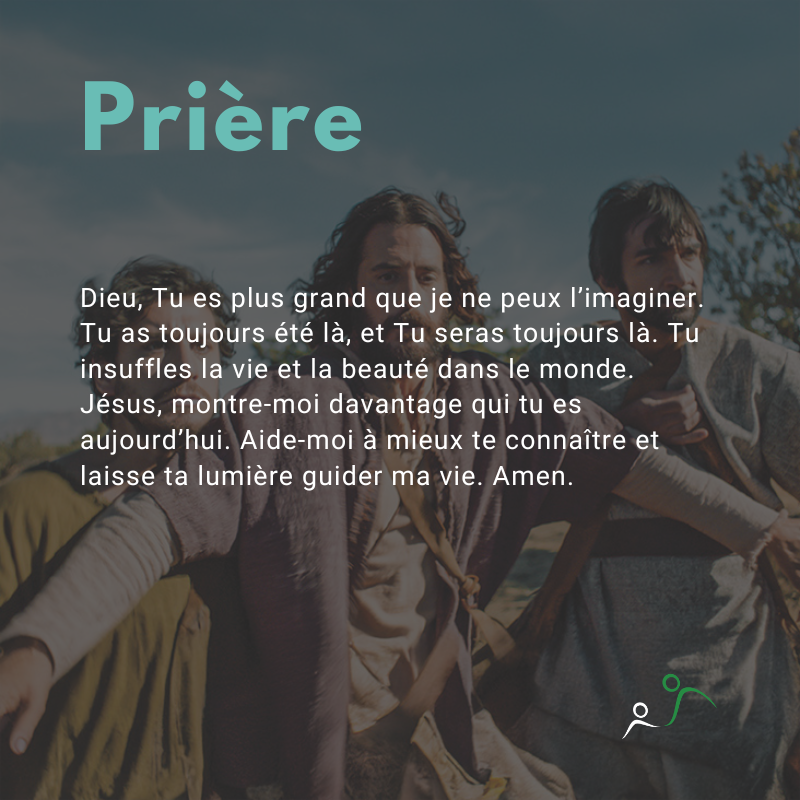 Dieu, Tu es plus grand que je ne peux l’imaginer. Tu as toujours été là, et Tu seras toujours là. Tu insuffles la vie et la beauté dans le monde. Jésus, montre-moi davantage qui tu es aujourd’hui. Aide-moi à mieux te connaître et laisse ta lumière guider ma vie. Amen.