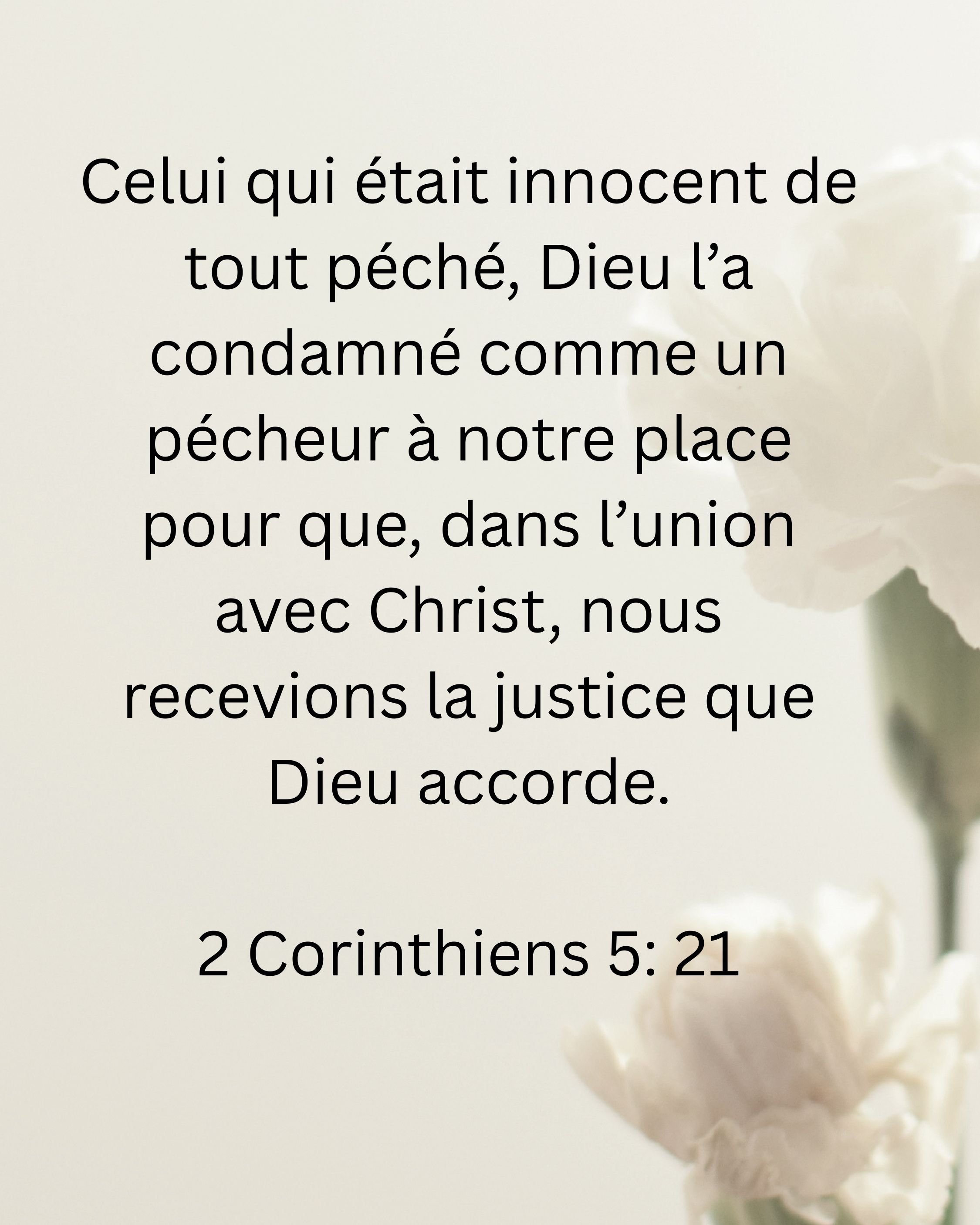 Celui qui était innocent de tout péché, Dieu l’a condamné comme un pécheur à notre place pour que, dans l’union avec Christ, nous recevions la justice que Dieu accorde.