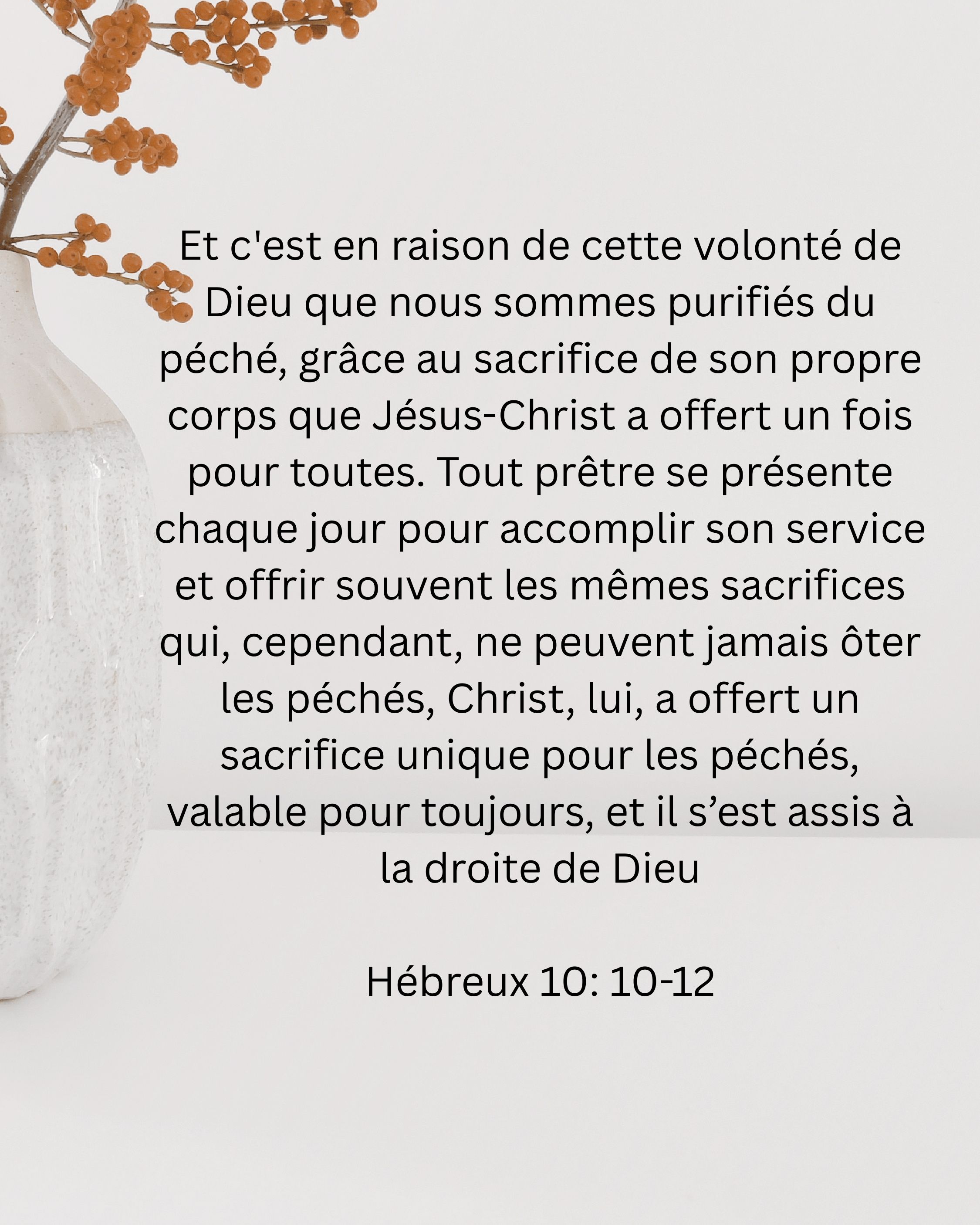 Et c'est en raison de cette volonté de Dieu que nous sommes purifiés du péché, grâce au sacrifice de son propre corps que Jésus-Christ a offert un fois pour toutes. Tout prêtre se présente chaque jour pour accomplir son service et offrir souvent les mêmes sacrifices qui, cependant, ne peuvent jamais ôter les péchés, Christ, lui, a offert un sacrifice unique pour les péchés, valable pour toujours, et il s’est assis à la droite de Dieu