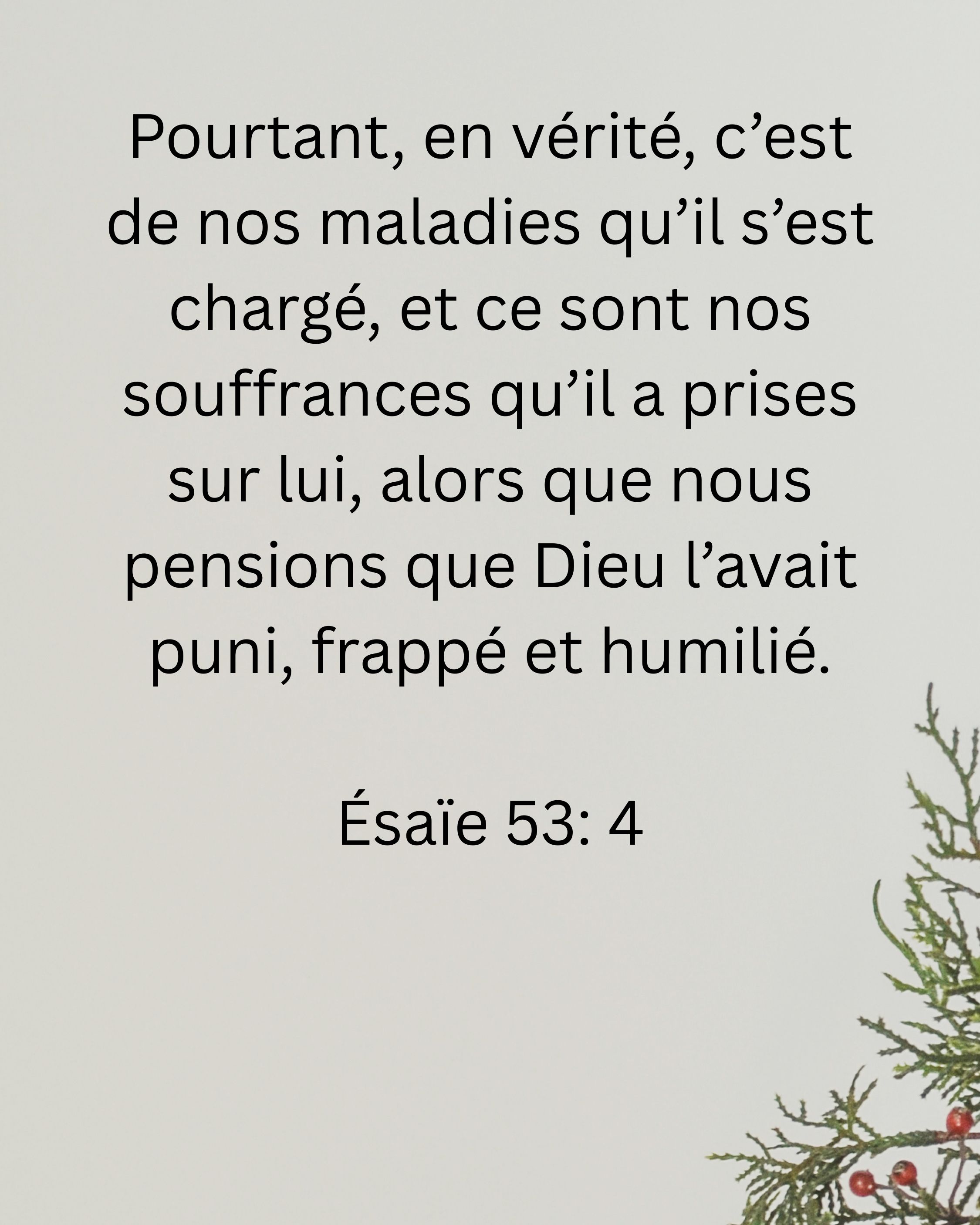 Pourtant, en vérité, c’est de nos maladies qu’il s’est chargé, et ce sont nos souffrances qu’il a prises sur lui, alors que nous pensions que Dieu l’avait puni, frappé et humilié.