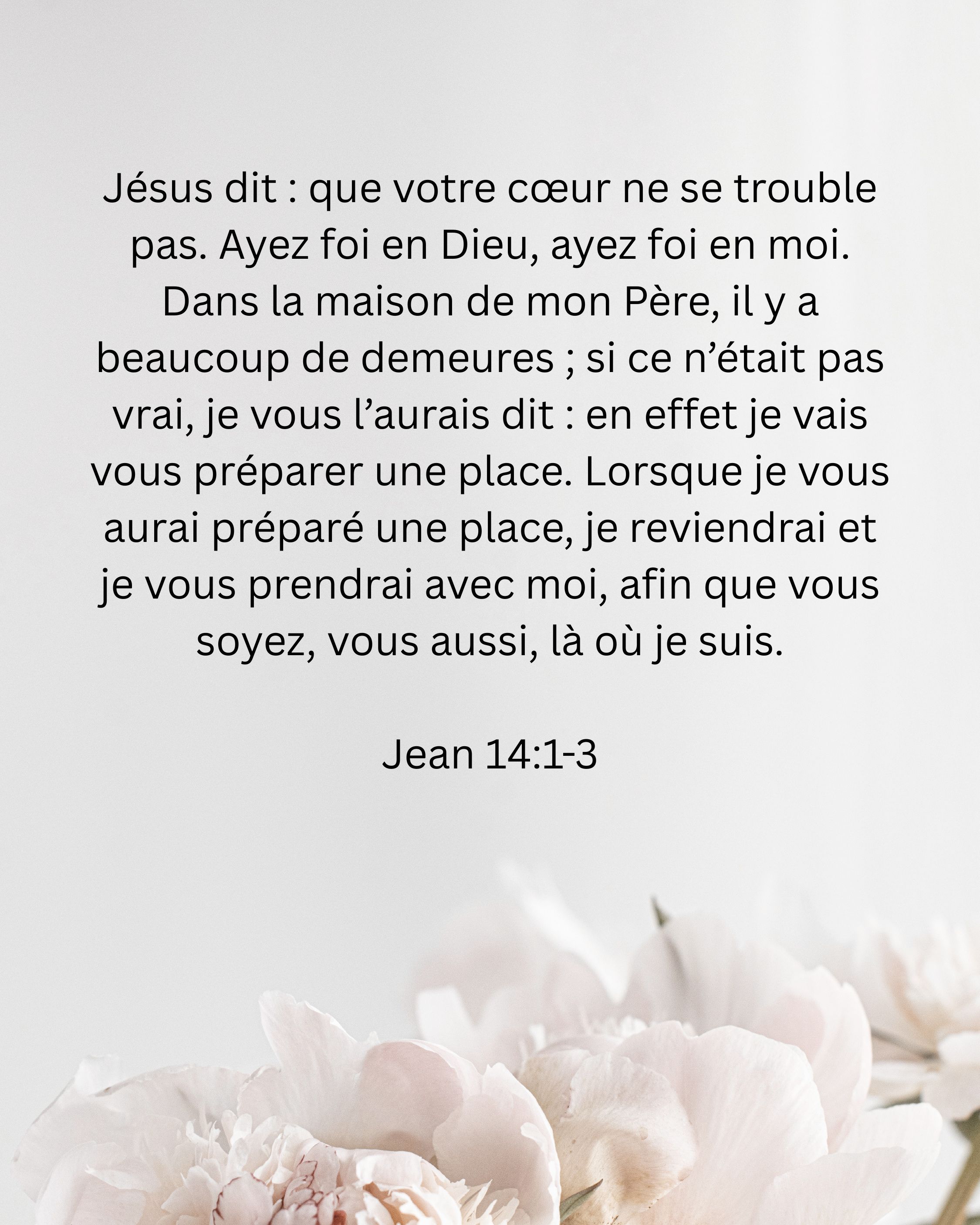 Jésus dit : que votre cœur ne se trouble pas. Ayez foi en Dieu, ayez foi en moi. Dans la maison de mon Père, il y a beaucoup de demeures ; si ce n’était pas vrai, je vous l’aurais dit : en effet je vais vous préparer une place. Lorsque je vous aurai préparé une place, je reviendrai et je vous prendrai avec moi, afin que vous soyez, vous aussi, là où je suis.