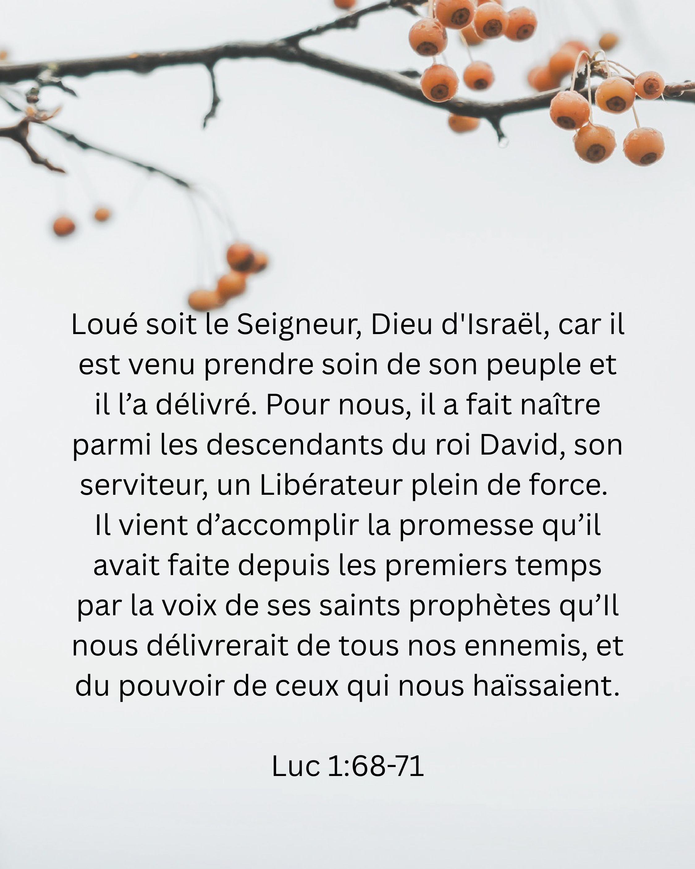 Loué soit le Seigneur, Dieu d'Israël, car il est venu prendre soin de son peuple et il l’a délivré. Pour nous, il a fait naître parmi les descendants du roi David, son serviteur, un Libérateur plein de force. Il vient d’accomplir la promesse qu’il avait faite depuis les premiers temps par la voix de ses saints prophètes qu’Il nous délivrerait de tous nos ennemis, et du pouvoir de ceux qui nous haïssaient.