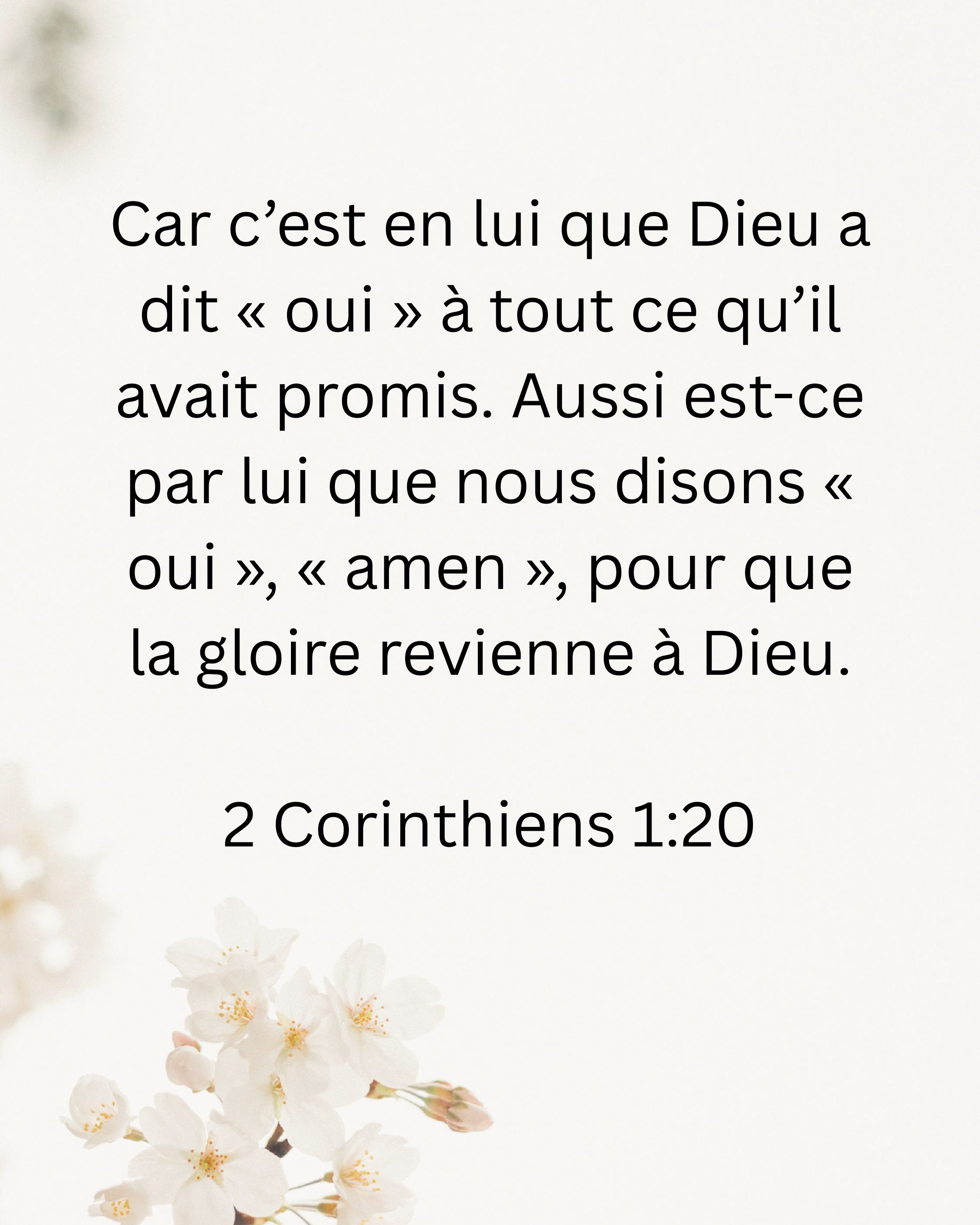 Notre verset à mémoriser cette semaine nous dit que toutes les promesses de Dieu sont "oui" en Lui. Nous voyons le "oui" des promesses de Dieu en Jésus-Christ. C'est pourquoi nous pouvons être sûres que Dieu continue à tenir toutes Ses promesses, même celles qui n'ont pas encore été tenues. Cette semaine, prenez le temps de noter et de partager les façons dont Dieu a tenu Ses promesses dans votre vie.