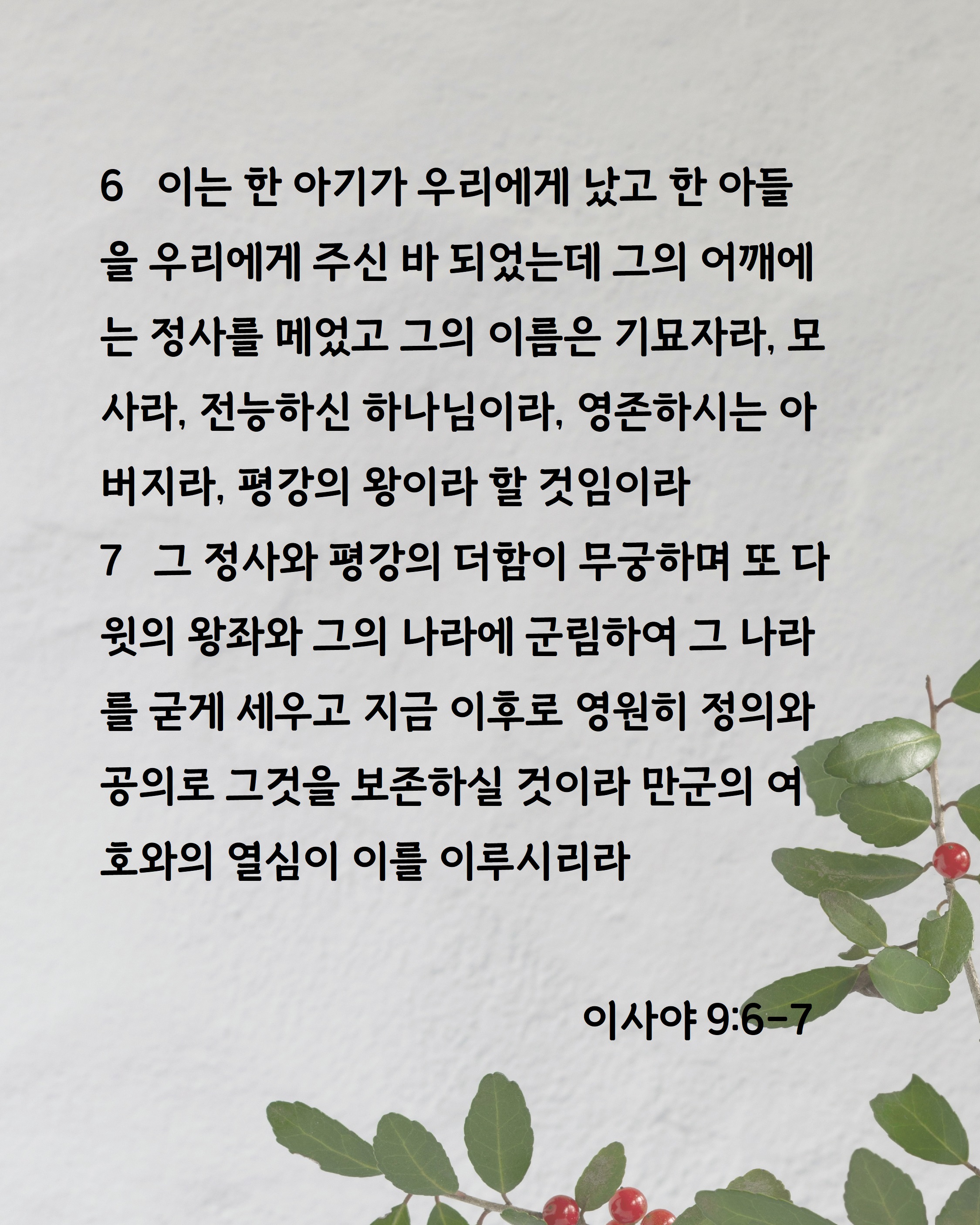 우리가 도움이 필요할 때 지혜를 주시고, 힘이 필요할 때 힘을 주시는 전능하신 하나님이시고, 우리를 결코 떠나지 않으시는 영원한 아버지이시고, 우리 마음에 평안을 주시는 평화의 왕이십니다.