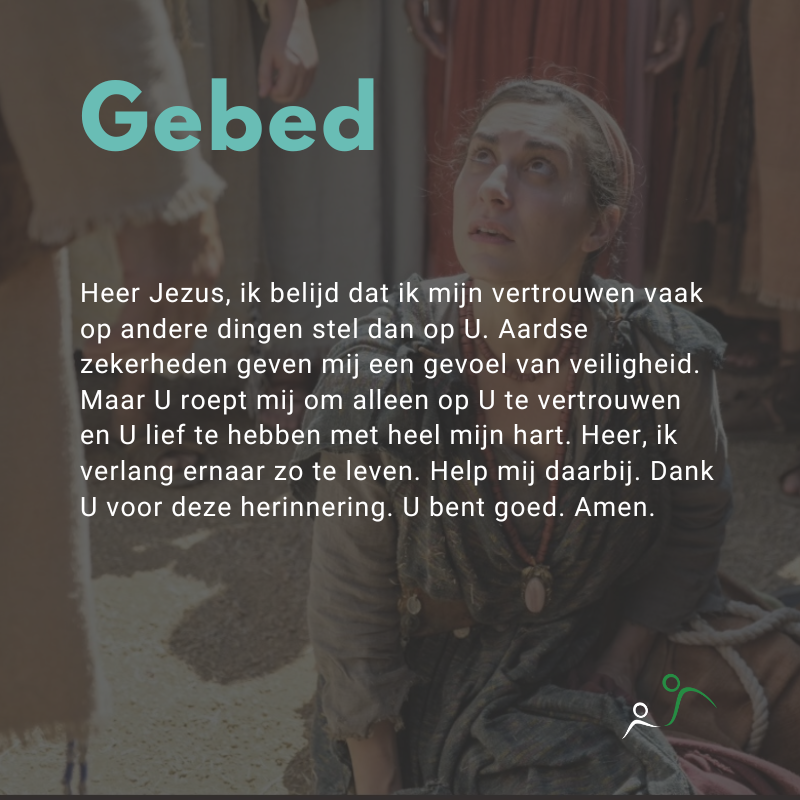 Heer Jezus, ik belijd dat ik mijn vertrouwen vaak op andere dingen stel dan op U. Aardse zekerheden geven mij een gevoel van veiligheid. Maar U roept mij om alleen op U te vertrouwen en U lief te hebben met heel mijn hart. Heer, ik verlang ernaar zo te leven. Help mij daarbij. Dank U voor deze herinnering. U bent goed. Amen.