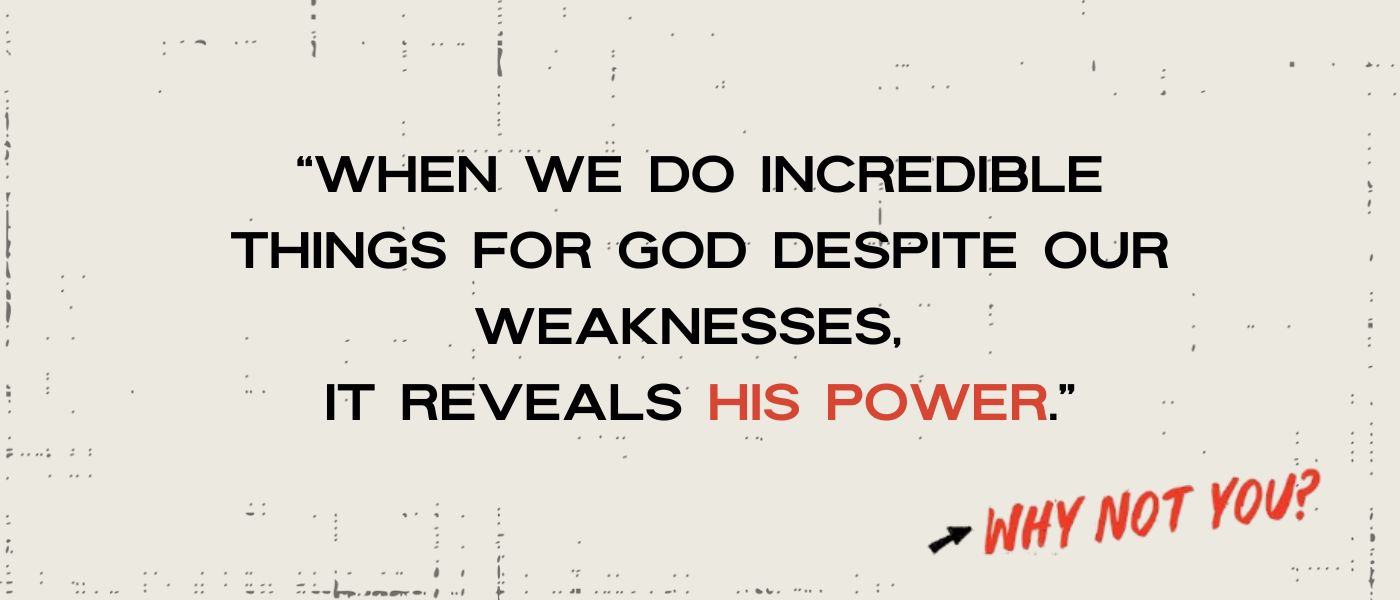 Why is this important? Because when we do incredible things for God despite our weaknesses, it reveals His power. On our own, our weaknesses would limit us from achieving what He has called us to do. But your weakness doesn’t disqualify you. God will do special things in and through you, and His power will be perfected wherever you are weak.