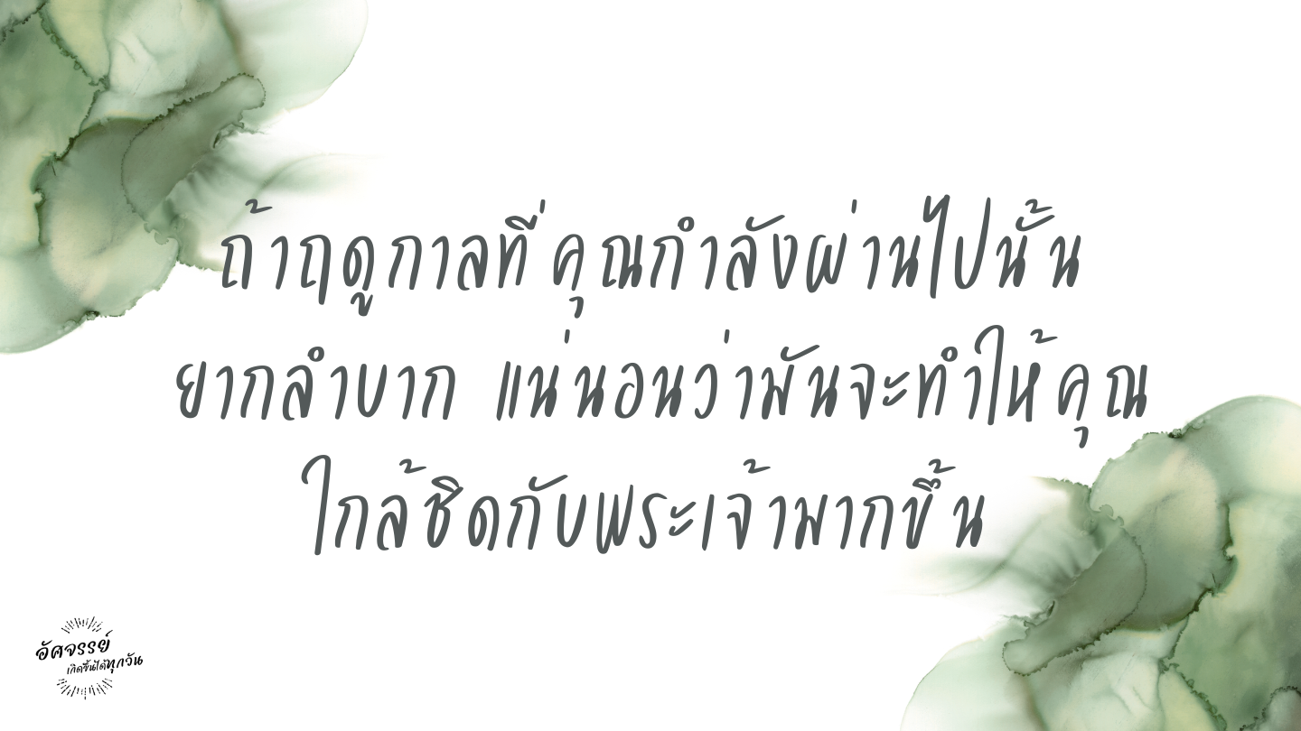 ในยามยาก คุณสามารถค้นพบอีกแง่มุมหนึ่งของพระเจ้า พัฒนาความสัมพันธ์ของคุณกับพระองค์ รู้จักพระองค์มากขึ้น และลึกซึ้งขึ้น อย่างแตกต่างออกไป